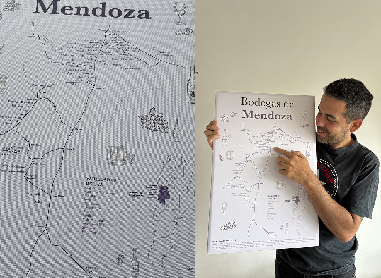 Bodegas de Mendoza Un regalo súper original, un mapa pineable para marcar todas las bodegas visitadas de Mendoza Se incluyó también las rutas y pines con su cajita. Impreso en tela y montado en bastidor resistente de madera listo para colgar. |