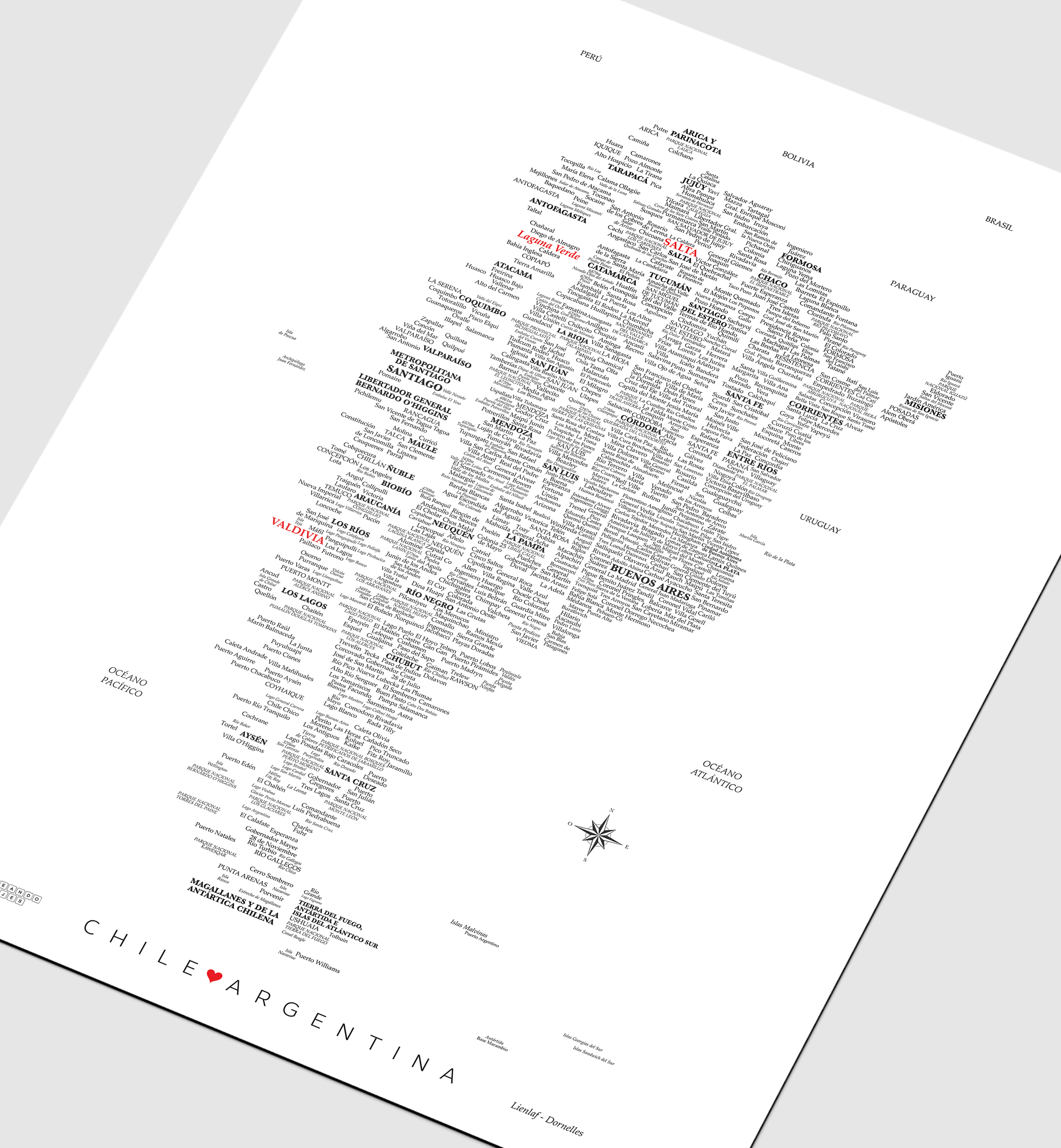 Mapa de Argentina con Chile Diseñamos el mapa de Chile destacando ciertos lugares donde marcaron la historia de una pareja. Uno de Argentina, otro de Chile y un mapa en tamaño personalizado de 1m de largo para recordar por siempre el amor. |